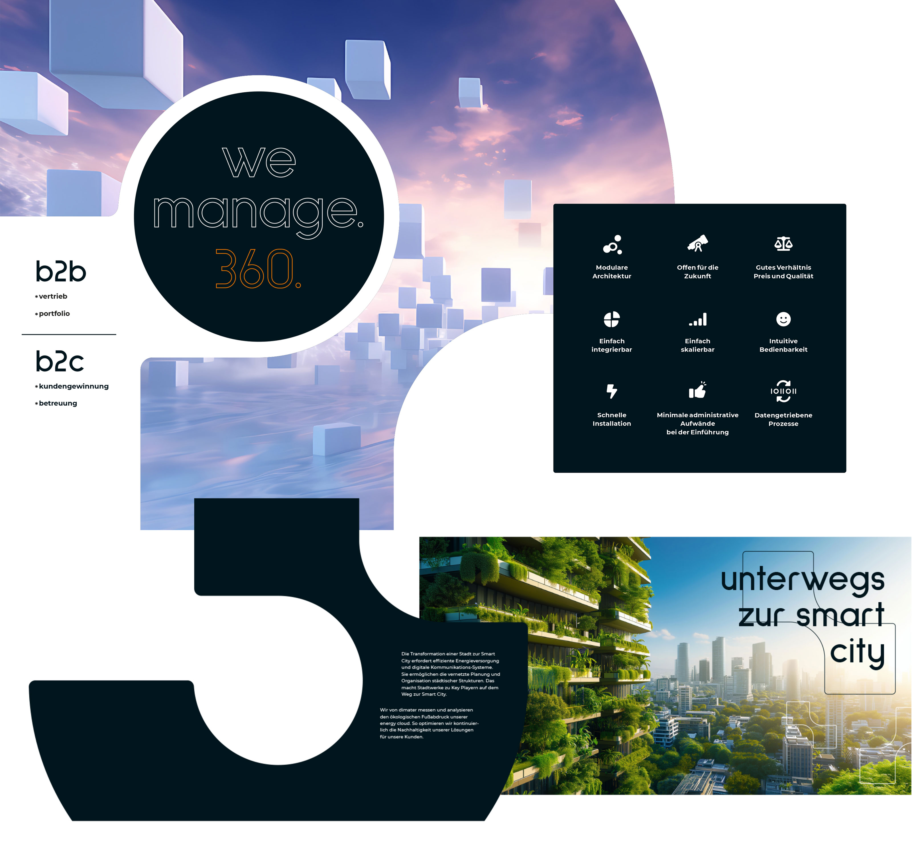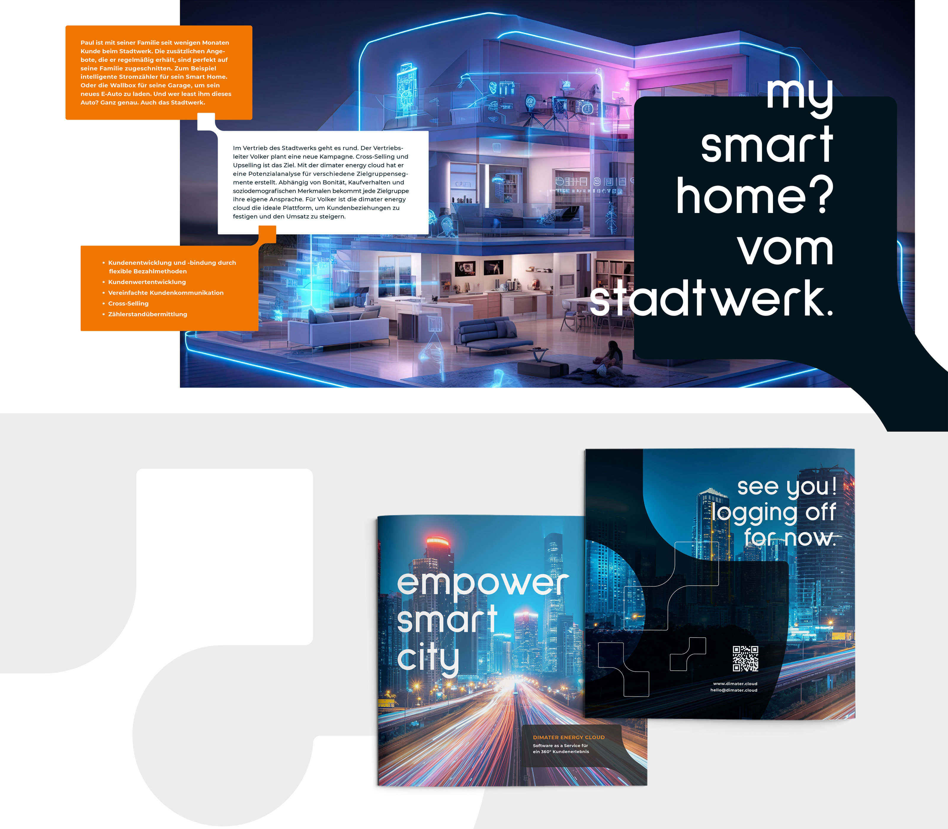 Die Transformation einer Stadt zur Smart City: eine große Herausforderung gerade auch für Stadtwerke und Energieversorger. Effiziente Versorgungsprozesse und bidirektionale digitale Kommunikations-Systeme sind gefordert, um Teilhabe und Lebensqualität der Bürger zu erhöhen. Unter dem Claim „Empower Smart City“ begleitet dimater seine Kunden aus der Energiewirtschaft auf diesem Weg. Das Thema visualisieren wir mit einer dem Bildzeichen entlehnten Bild- und Formensprache, die Aufmerksamkeit schafft und die Marke stärkt. Mit anschaulichem Storytelling inszenieren wir dabei das Kundenerlebnis von morgen.