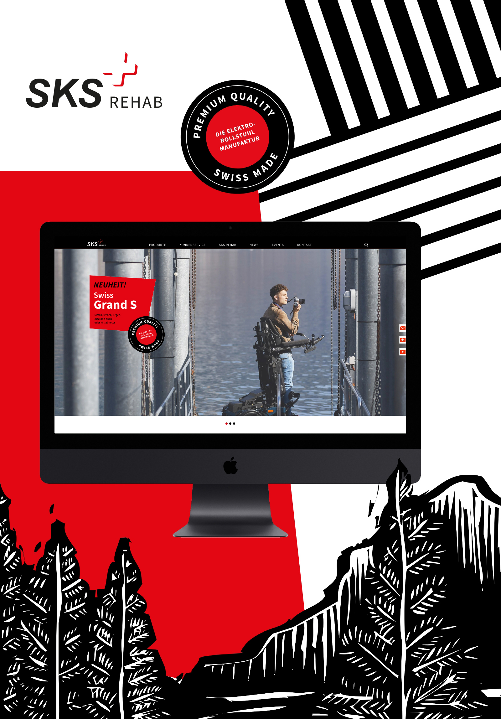 Farbschema und markante Holzschnitte vertreten die Schweiz. Die Ingenieurleistung findet Ausdruck im Umgang mit der Typografie. Grafische Elemente – plakativ und agil im Einsatz – spiegeln die Wendigkeit des Produkts. Gleichzeitig drücken sie aus, wie das SKS Team mit seinen Kunden umgeht. Eben auch wendig, zugewandt und offen. Kurz: Unkompliziert und verbindlich. So auch der neue Markenauftritt.